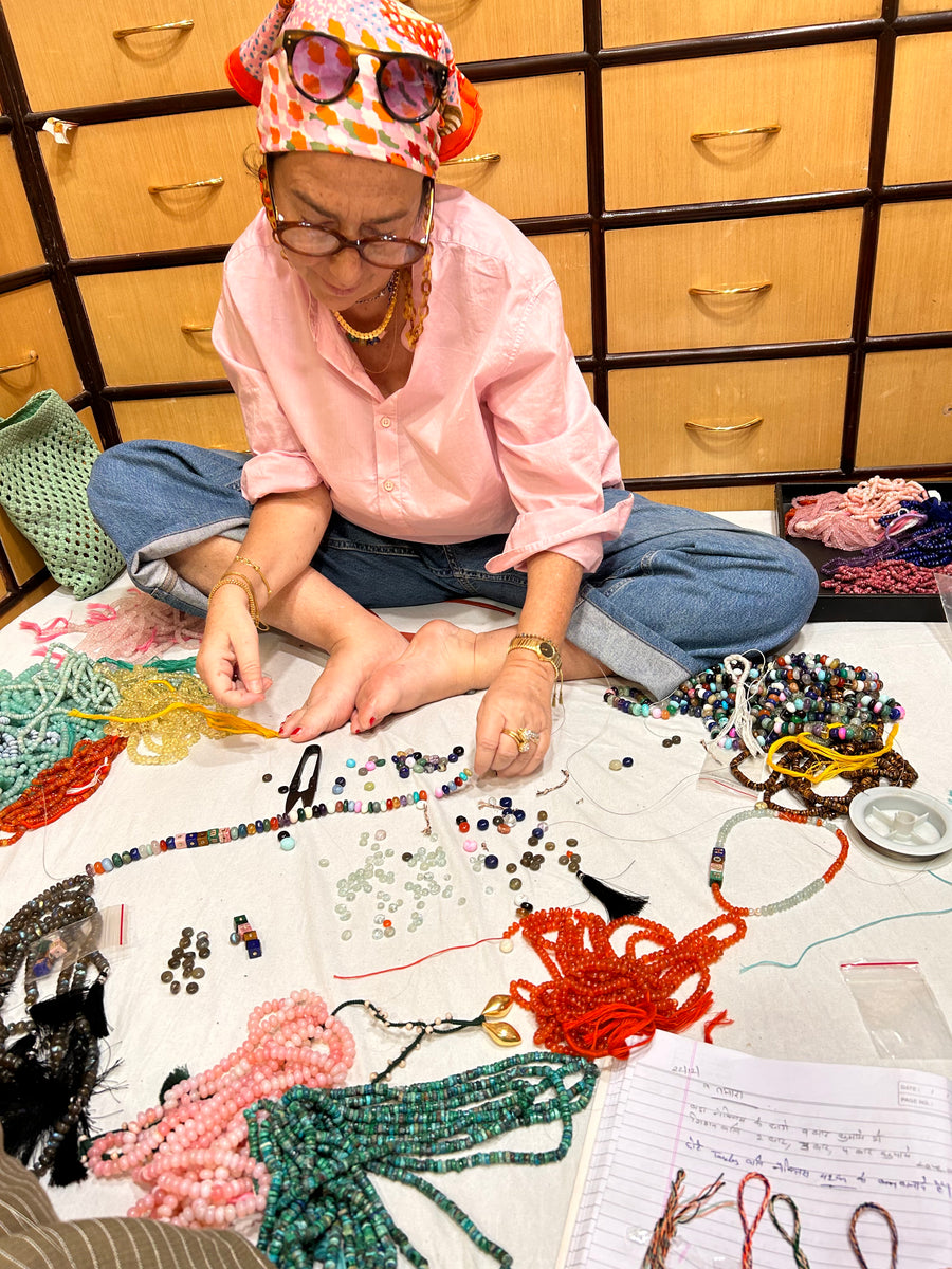 Everything was therefore in place for her to start in turn. Handmade by the best Indian artisans whom she accompanies step by step, her collection of limited edition pieces is joyful and refined. His great culture and his personal style, nourished by multiple references, gives playful and singular jewels which play with the usual codes of chic. A multicolored necklace comes alive with dice of hard stones engraved with diamond letters "Love", "Hope »…precious version of those made by little girls for their mothers. On a ring, snakes a happy reptile in black or pink lacquer whose eyes shine and whose tongue is a nicely swaying briolette. At the end of a necklace of colorful threads, a tangle of pearls and stones is nonchalantly tied. Another necklace of tourmaline, opal, sapphire or ruby stones evokes a candy necklace. The whole has style and spirit.